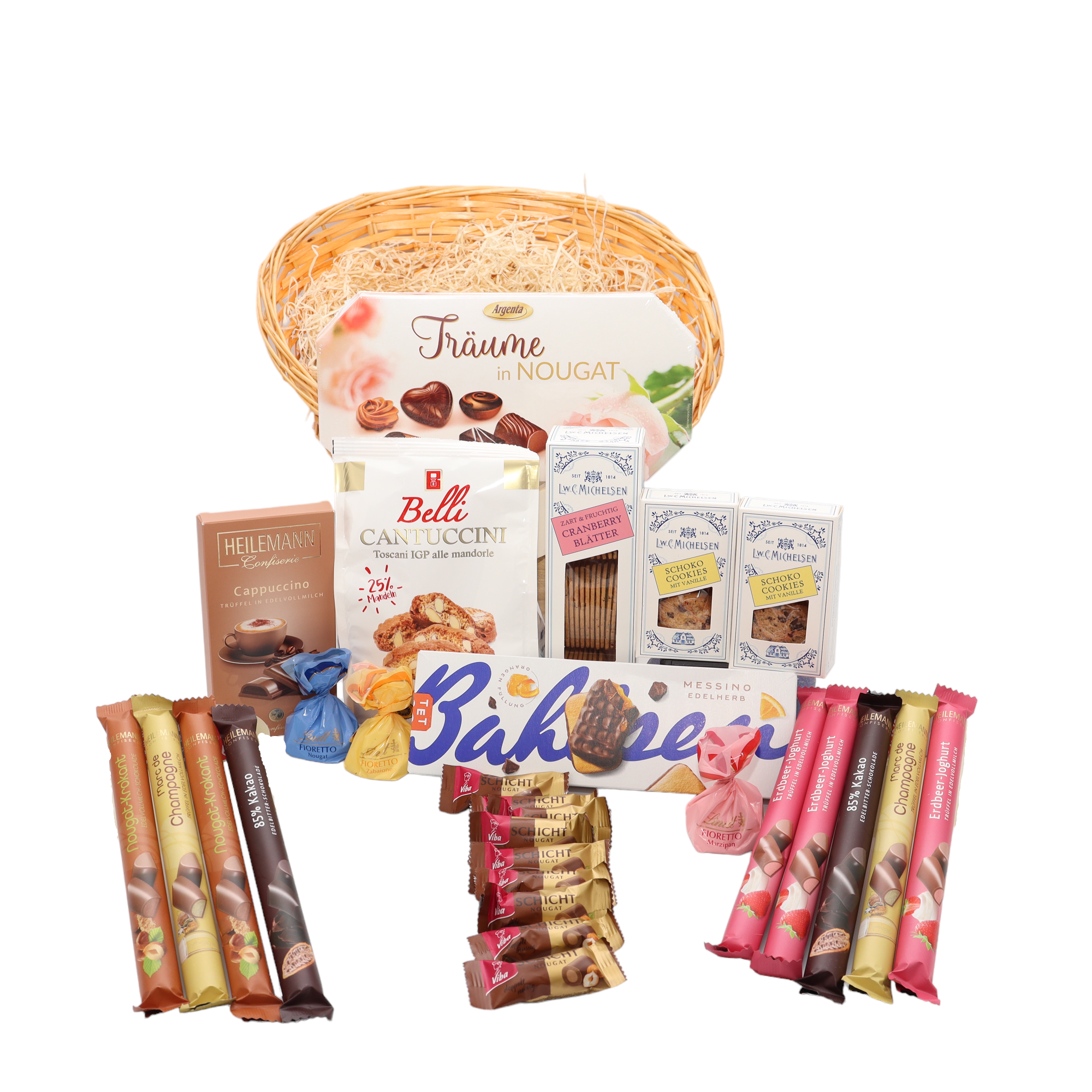 Zucker, Kakaomasse, Kakaobutter, MANDELN 9%, HASELNÜSSE 6%, VOLLMILCHPULVER, pflanzliche Fette (Palm, Kokosnuss, Palmkern), SAHNEPULVER, Waffel (WEIZENMEHL, WEIZENSTÄRKE, Kokosfett, Emulgator: SOJALECITHINE; Salz, Backtriebmittel: Natriumcarbonat), BUTTERREINFETT, MAGERMILCHPULVER, Waffelröllchen (WEIZENMEHL, Zucker, Glukosesirup, Rapsöl, MOLKENERZEUGNIS, Emulgator: Rapslecithine; Salz, Aroma, Farbstoff: Paprikaextrakt), MOLKENERZEUGNIS, Emulgator: SOJA- und Sonnenblumenlecithine; fettarmes Kakaopulver, Dextrose, Feuchthaltemittel: Sorbit; Rum, Vanilleextrakt, natürliches Vanillearoma. Enthält Gluten. Kann Spuren von ERDNUSS und anderen SCHALENFRÜCHTEN (Pistazie, Walnuss und Macadamianuss) enthalten.